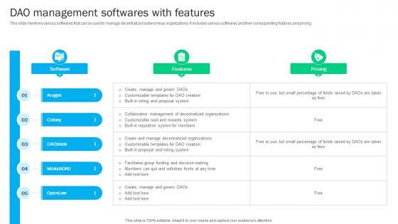 This slide mentions various softwares that can be used to manage decentralized autonomous organizations. It includes various softwares and their corresponding features and pricing. Slidegeeks is here to make your presentations a breeze with Blockchain Basics Understanding Dao Management Softwares Ppt Template BCT SS V With our easy-to-use and customizable templates, you can focus on delivering your ideas rather than worrying about formatting. With a variety of designs to choose from, you are sure to find one that suits your needs. And with animations and unique photos, illustrations, and fonts, you can make your presentation pop. So whether you are giving a sales pitch or presenting to the board, make sure to check out Slidegeeks first This slide mentions various softwares that can be used to manage decentralized autonomous organizations. It includes various softwares and their corresponding features and pricing.