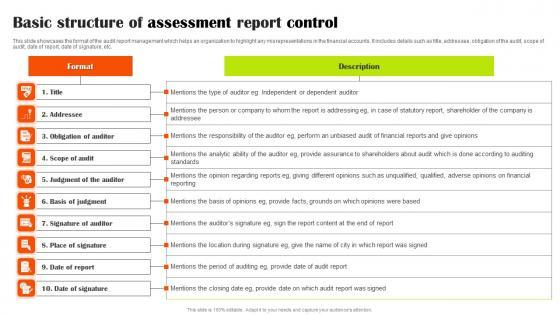 This slide showcases the format of the audit report management which helps an organization to highlight any misrepresentations in the financial accounts. It includes details such as title, addressee, obligation of the audit, scope of audit, date of report, date of signature, etc. Showcasing this set of slides titled Basic Structure Of Assessment Report Control Topics Pdf The topics addressed in these templates are Addressee, Obligation Of Auditor, Signature Of Auditor All the content presented in this PPT design is completely editable. Download it and make adjustments in color, background, font etc. as per your unique business setting. This slide showcases the format of the audit report management which helps an organization to highlight any misrepresentations in the financial accounts. It includes details such as title, addressee, obligation of the audit, scope of audit, date of report, date of signature, etc.