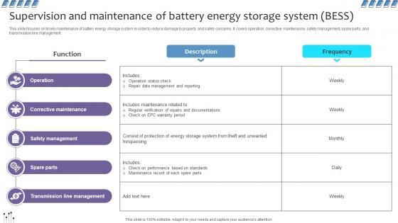 This slide focuses on timely maintenance of battery energy storage system in order to reduce damage to property and safety concerns. It covers operation, corrective maintenance, safety management, spare parts, and transmission line management. Retrieve professionally designed Empowering The Future Supervision And Maintenance Of Battery Energy Storage IoT SS V to effectively convey your message and captivate your listeners. Save time by selecting pre-made slideshows that are appropriate for various topics, from business to educational purposes. These themes come in many different styles, from creative to corporate, and all of them are easily adjustable and can be edited quickly. Access them as PowerPoint templates or as Google Slides themes. You do not have to go on a hunt for the perfect presentation because Slidegeeks got you covered from everywhere. This slide focuses on timely maintenance of battery energy storage system in order to reduce damage to property and safety concerns. It covers operation, corrective maintenance, safety management, spare parts, and transmission line management.