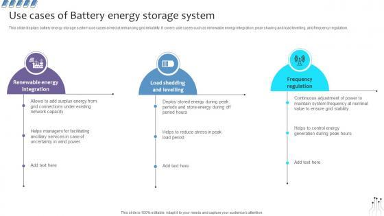 This slide displays battery energy storage system use cases aimed at enhancing grid reliability. It covers use cases such as renewable energy integration, peak shaving and load levelling, and frequency regulation. This Empowering The Future Use Cases Of Battery Energy Storage System IoT SS V from Slidegeeks makes it easy to present information on your topic with precision. It provides customization options, so you can make changes to the colors, design, graphics, or any other component to create a unique layout. It is also available for immediate download, so you can begin using it right away. Slidegeeks has done good research to ensure that you have everything you need to make your presentation stand out. Make a name out there for a brilliant performance. This slide displays battery energy storage system use cases aimed at enhancing grid reliability. It covers use cases such as renewable energy integration, peak shaving and load levelling, and frequency regulation.