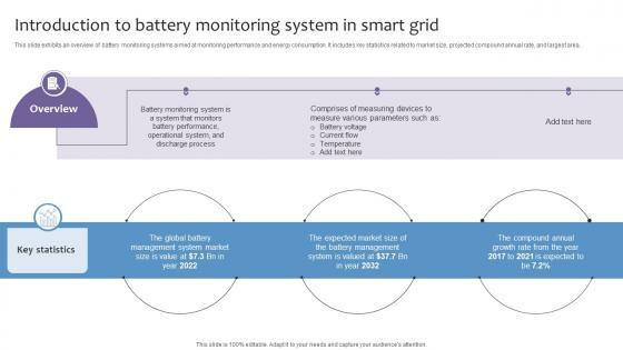 This slide exhibits an overview of battery monitoring systems aimed at monitoring performance and energy consumption. It includes key statistics related to market size, projected compound annual rate, and largest area. Welcome to our selection of the Empowering The Future Introduction To Battery Monitoring System In Smart Grid IoT SS V. These are designed to help you showcase your creativity and bring your sphere to life. Planning and Innovation are essential for any business that is just starting out. This collection contains the designs that you need for your everyday presentations. All of our PowerPoints are 100Percent editable, so you can customize them to suit your needs. This multi-purpose template can be used in various situations. Grab these presentation templates today. This slide exhibits an overview of battery monitoring systems aimed at monitoring performance and energy consumption. It includes key statistics related to market size, projected compound annual rate, and largest area.