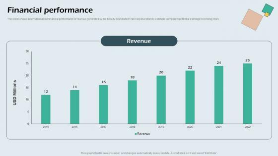 This slide shows information about financial performance or revenue generated by the beauty brand which can help investors to estimate companys potential earnings in coming years. Present like a pro with Financial Performance Beauty Brand Capital Raising Pitch Deck Demonstration Pdf Create beautiful presentations together with your team, using our easy to use presentation slides. Share your ideas in real time and make changes on the fly by downloading our templates. So whether you are in the office, on the go, or in a remote location, you can stay in sync with your team and present your ideas with confidence. With Slidegeeks presentation got a whole lot easier. Grab these presentations today. This slide shows information about financial performance or revenue generated by the beauty brand which can help investors to estimate companys potential earnings in coming years.