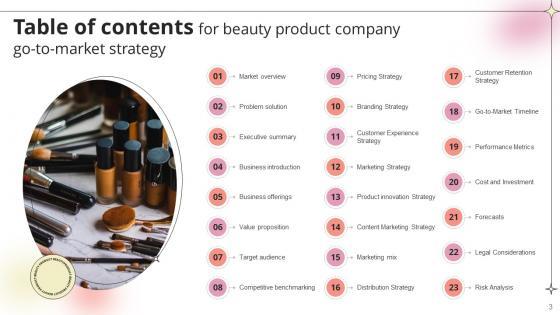 Welcome to our selection of the Table Of Contents For Beauty Product Company Go To Market Strategy GTM SS V. These are designed to help you showcase your creativity and bring your sphere to life. Planning and Innovation are essential for any business that is just starting out. This collection contains the designs that you need for your everyday presentations. All of our PowerPoints are 100 percent editable, so you can customize them to suit your needs. This multi-purpose template can be used in various situations. Grab these presentation templates today. Our Table Of Contents For Beauty Product Company Go To Market Strategy GTM SS V are topically designed to provide an attractive backdrop to any subject. Use them to look like a presentation pro.