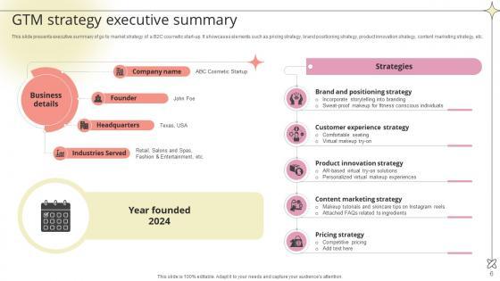 This slide presents executive summary of go to market strategy of a B2C cosmetic start-up. It showcases elements such as pricing strategy, brand positioning strategy, product innovation strategy, content marketing strategy, etc.Whether you have daily or monthly meetings, a brilliant presentation is necessary. GTM Strategy Executive Summary Beauty Product Company Go To Market Strategy GTM SS V can be your best option for delivering a presentation. Represent everything in detail using GTM Strategy Executive Summary Beauty Product Company Go To Market Strategy GTM SS V and make yourself stand out in meetings. The template is versatile and follows a structure that will cater to your requirements. All the templates prepared by Slidegeeks are easy to download and edit. Our research experts have taken care of the corporate themes as well. So, give it a try and see the results. This slide presents executive summary of go to market strategy of a B2C cosmetic start-up. It showcases elements such as pricing strategy, brand positioning strategy, product innovation strategy, content marketing strategy, etc.