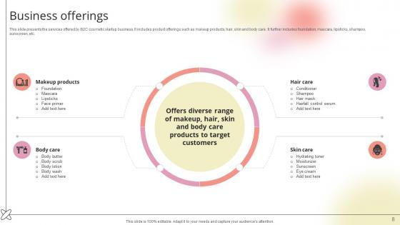 This slide presents the services offered by B2C cosmetic startup business. It includes product offerings such as makeup products, hair, skin and body care. It further includes foundation, mascara, lipsticks, shampoo, sunscreen, etc.Slidegeeks is one of the best resources for PowerPoint templates. You can download easily and regulate Business Offerings Beauty Product Company Go To Market Strategy GTM SS V for your personal presentations from our wonderful collection. A few clicks is all it takes to discover and get the most relevant and appropriate templates. Use our Templates to add a unique zing and appeal to your presentation and meetings. All the slides are easy to edit and you can use them even for advertisement purposes. This slide presents the services offered by B2C cosmetic startup business. It includes product offerings such as makeup products, hair, skin and body care. It further includes foundation, mascara, lipsticks, shampoo, sunscreen, etc.
