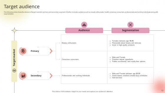 The following slide shows the division of target market in primary and secondary segment. It further includes audience such as beauty enthusiasts, health-conscious consumers, professionals and working individuals along with segmentation.Explore a selection of the finest Target Audience Beauty Product Company Go To Market Strategy GTM SS V here. With a plethora of professionally designed and pre-made slide templates, you can quickly and easily find the right one for your upcoming presentation. You can use our Target Audience Beauty Product Company Go To Market Strategy GTM SS V to effectively convey your message to a wider audience. Slidegeeks has done a lot of research before preparing these presentation templates. The content can be personalized and the slides are highly editable. Grab templates today from Slidegeeks. The following slide shows the division of target market in primary and secondary segment. It further includes audience such as beauty enthusiasts, health-conscious consumers, professionals and working individuals along with segmentation.