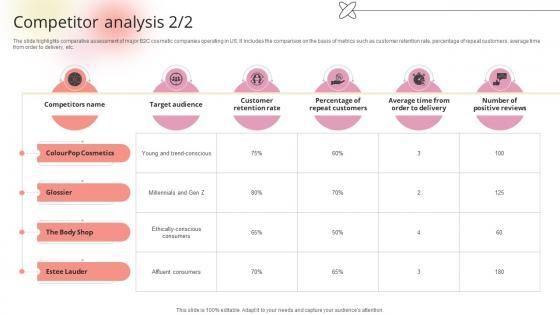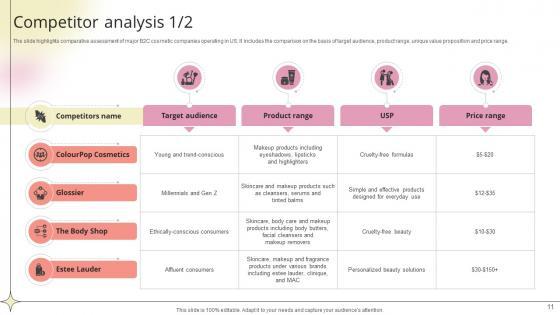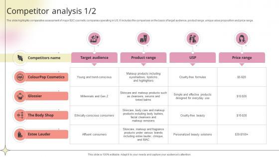 The slide highlights comparative assessment of major B2C cosmetic companies operating in US. It includes the comparison on the basis of target audience, product range, unique value proposition and price range.Want to ace your presentation in front of a live audience Our Competitor Analysis Beauty Product Company Go To Market Strategy GTM SS V can help you do that by engaging all the users towards you. Slidegeeks experts have put their efforts and expertise into creating these impeccable powerpoint presentations so that you can communicate your ideas clearly. Moreover, all the templates are customizable, and easy-to-edit and downloadable. Use these for both personal and commercial use. The slide highlights comparative assessment of major B2C cosmetic companies operating in US. It includes the comparison on the basis of target audience, product range, unique value proposition and price range.