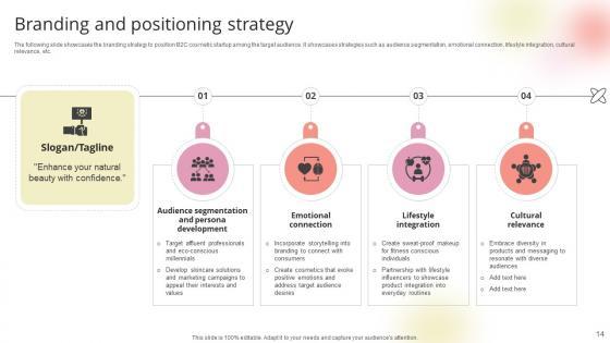 The following slide showcases the branding strategy to position B2C cosmetic startup among the target audience. It showcases strategies such as audience segmentation, emotional connection, lifestyle integration, cultural relevance, etc.Boost your pitch with our creative Branding And Positioning Strategy Beauty Product Company Go To Market Strategy GTM SS V. Deliver an awe-inspiring pitch that will mesmerize everyone. Using these presentation templates you will surely catch everyones attention. You can browse the ppts collection on our website. We have researchers who are experts at creating the right content for the templates. So you do not have to invest time in any additional work. Just grab the template now and use them. The following slide showcases the branding strategy to position B2C cosmetic startup among the target audience. It showcases strategies such as audience segmentation, emotional connection, lifestyle integration, cultural relevance, etc.