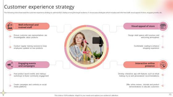 The following slide showcases the customer experience strategy to optimize B2C startup among the target audience. It showcases strategies which includes well informed staff, visual appeal of store, engaging events, etc.Get a simple yet stunning designed Customer Experience Strategy Beauty Product Company Go To Market Strategy GTM SS V. It is the best one to establish the tone in your meetings. It is an excellent way to make your presentations highly effective. So, download this PPT today from Slidegeeks and see the positive impacts. Our easy-to-edit Customer Experience Strategy Beauty Product Company Go To Market Strategy GTM SS V can be your go-to option for all upcoming conferences and meetings. So, what are you waiting for Grab this template today. The following slide showcases the customer experience strategy to optimize B2C startup among the target audience. It showcases strategies which includes well informed staff, visual appeal of store, engaging events, etc.
