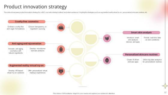 The slide showcases product innovation strategy for a B2C cosmetic startup to attract and retain audience. It highlights strategies such as augmented reality virtual try-on, personalized skincare routines, etc.This modern and well-arranged Product Innovation Strategy Beauty Product Company Go To Market Strategy GTM SS V provides lots of creative possibilities. It is very simple to customize and edit with the Powerpoint Software. Just drag and drop your pictures into the shapes. All facets of this template can be edited with Powerpoint, no extra software is necessary. Add your own material, put your images in the places assigned for them, adjust the colors, and then you can show your slides to the world, with an animated slide included. The slide showcases product innovation strategy for a B2C cosmetic startup to attract and retain audience. It highlights strategies such as augmented reality virtual try-on, personalized skincare routines, etc.