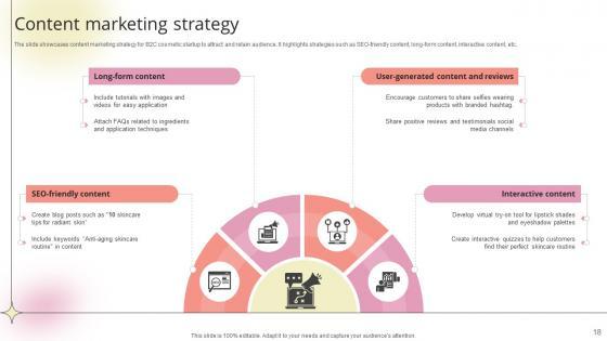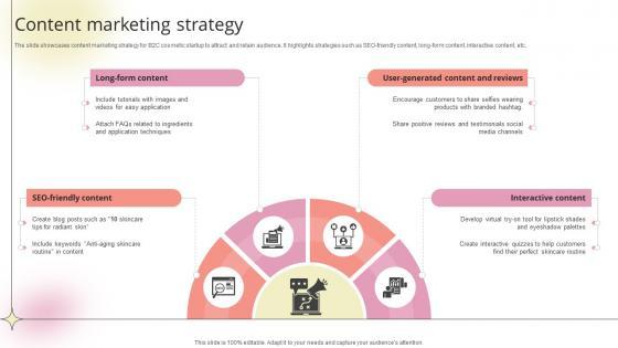 The slide showcases content marketing strategy for B2C cosmetic startup to attract and retain audience. It highlights strategies such as SEO-friendly content, long-form content, interactive content, etc.There are so many reasons you need a Content Marketing Strategy Beauty Product Company Go To Market Strategy GTM SS V. The first reason is you can not spend time making everything from scratch, Thus, Slidegeeks has made presentation templates for you too. You can easily download these templates from our website easily. The slide showcases content marketing strategy for B2C cosmetic startup to attract and retain audience. It highlights strategies such as SEO-friendly content, long-form content, interactive content, etc.