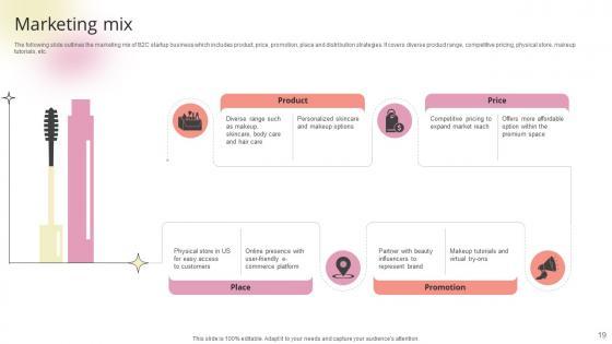 The following slide outlines the marketing mix of B2C startup business which includes product, price, promotion, place and distribution strategies. It covers diverse product range, competitive pricing, physical store, makeup tutorials, etc.Are you in need of a template that can accommodate all of your creative concepts This one is crafted professionally and can be altered to fit any style. Use it with Google Slides or PowerPoint. Include striking photographs, symbols, depictions, and other visuals. Fill, move around, or remove text boxes as desired. Test out color palettes and font mixtures. Edit and save your work, or work with colleagues. Download Marketing Mix Beauty Product Company Go To Market Strategy GTM SS V and observe how to make your presentation outstanding. Give an impeccable presentation to your group and make your presentation unforgettable. The following slide outlines the marketing mix of B2C startup business which includes product, price, promotion, place and distribution strategies. It covers diverse product range, competitive pricing, physical store, makeup tutorials, etc.