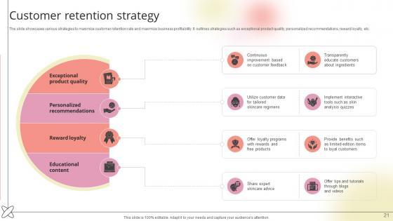 The slide showcases various strategies to maximize customer retention rate and maximize business profitability. It outlines strategies such as exceptional product quality, personalized recommendations, reward loyalty, etc.From laying roadmaps to briefing everything in detail, our templates are perfect for you. You can set the stage with your presentation slides. All you have to do is download these easy-to-edit and customizable templates. Customer Retention Strategy Beauty Product Company Go To Market Strategy GTM SS V will help you deliver an outstanding performance that everyone would remember and praise you for. Do download this presentation today. The slide showcases various strategies to maximize customer retention rate and maximize business profitability. It outlines strategies such as exceptional product quality, personalized recommendations, reward loyalty, etc.