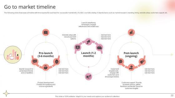 The following slide showcases a timeline with time required for each task for successful market entry of a B2C cosmetic startup. It depicts tasks such as market research, branding, hiring, website setup, customers support, etc.Do you have an important presentation coming up Are you looking for something that will make your presentation stand out from the rest Look no further than Go To Market Timeline Beauty Product Company Go To Market Strategy GTM SS V. With our professional designs, you can trust that your presentation will pop and make delivering it a smooth process. And with Slidegeeks, you can trust that your presentation will be unique and memorable. So why wait Grab Go To Market Timeline Beauty Product Company Go To Market Strategy GTM SS V today and make your presentation stand out from the rest The following slide showcases a timeline with time required for each task for successful market entry of a B2C cosmetic startup. It depicts tasks such as market research, branding, hiring, website setup, customers support, etc.