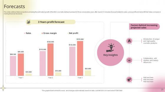 The slide outlines future projections showing the estimated growth of the B2C cosmetic startup business for three consecutive years after launch. It includes forecast related to sales, gross profit and net profit that helps company in making financial decisions.Slidegeeks is here to make your presentations a breeze with Forecasts Beauty Product Company Go To Market Strategy GTM SS V With our easy-to-use and customizable templates, you can focus on delivering your ideas rather than worrying about formatting. With a variety of designs to choose from, you are sure to find one that suits your needs. And with animations and unique photos, illustrations, and fonts, you can make your presentation pop. So whether you are giving a sales pitch or presenting to the board, make sure to check out Slidegeeks first The slide outlines future projections showing the estimated growth of the B2C cosmetic startup business for three consecutive years after launch. It includes forecast related to sales, gross profit and net profit that helps company in making financial decisions.