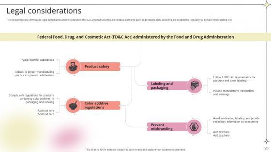 The following slide showcases legal compliance and considerations for B2C cosmetic startup. It includes elements such as product safety, labelling, color addictive regulations, prevent misbranding, etc.If your project calls for a presentation, then Slidegeeks is your go-to partner because we have professionally designed, easy-to-edit templates that are perfect for any presentation. After downloading, you can easily edit Legal Considerations Beauty Product Company Go To Market Strategy GTM SS V and make the changes accordingly. You can rearrange slides or fill them with different images. Check out all the handy templates The following slide showcases legal compliance and considerations for B2C cosmetic startup. It includes elements such as product safety, labelling, color addictive regulations, prevent misbranding, etc.