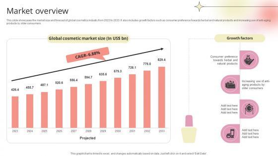 This slide showcases the market size and forecast of global cosmetics industry from 2023 to 2033. It also includes growth factors such as consumer preference towards herbal and natural products and increasing use of anti-aging products by older consumers.If you are looking for a format to display your unique thoughts, then the professionally designed Market Overview Beauty Product Company Go To Market Strategy GTM SS V is the one for you. You can use it as a Google Slides template or a PowerPoint template. Incorporate impressive visuals, symbols, images, and other charts. Modify or reorganize the text boxes as you desire. Experiment with shade schemes and font pairings. Alter, share or cooperate with other people on your work. Download Market Overview Beauty Product Company Go To Market Strategy GTM SS V and find out how to give a successful presentation. Present a perfect display to your team and make your presentation unforgettable. This slide showcases the market size and forecast of global cosmetics industry from 2023 to 2033. It also includes growth factors such as consumer preference towards herbal and natural products and increasing use of anti-aging products by older consumers.