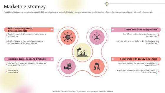 This slide highlights various promotional strategies for B2C cosmetic startup company which includes build community across different channels, create omnichannel experience, collaborate with beauty influencers, etc.Crafting an eye-catching presentation has never been more straightforward. Let your presentation shine with this tasteful yet straightforward Marketing Strategy Beauty Product Company Go To Market Strategy GTM SS V template. It offers a minimalistic and classy look that is great for making a statement. The colors have been employed intelligently to add a bit of playfulness while still remaining professional. Construct the ideal Marketing Strategy Beauty Product Company Go To Market Strategy GTM SS V that effortlessly grabs the attention of your audience Begin now and be certain to wow your customers This slide highlights various promotional strategies for B2C cosmetic startup company which includes build community across different channels, create omnichannel experience, collaborate with beauty influencers, etc.