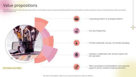 This slide showcases the unique value proposition of B2C cosmetic startup company. It includes long lasting products for prolonged hydration, prioritize sustainable sourcing, eco-friendly packaging, offers personalized recommendations, etc.The best PPT templates are a great way to save time, energy, and resources. Slidegeeks have 100 percent editable powerpoint slides making them incredibly versatile. With these quality presentation templates, you can create a captivating and memorable presentation by combining visually appealing slides and effectively communicating your message. Download Value Propositions Beauty Product Company Go To Market Strategy GTM SS V from Slidegeeks and deliver a wonderful presentation. This slide showcases the unique value proposition of B2C cosmetic startup company. It includes long lasting products for prolonged hydration, prioritize sustainable sourcing, eco-friendly packaging, offers personalized recommendations, etc.