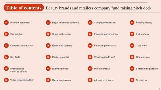 Want to ace your presentation in front of a live audience Our Table Of Contents Beauty Brands And Retailers Company Fund Raising Pitch Deck Sample Pdf can help you do that by engaging all the users towards you. Slidegeeks experts have put their efforts and expertise into creating these impeccable powerpoint presentations so that you can communicate your ideas clearly. Moreover, all the templates are customizable, and easy-to-edit and downloadable. Use these for both personal and commercial use. Our Table Of Contents Beauty Brands And Retailers Company Fund Raising Pitch Deck Sample Pdf are topically designed to provide an attractive backdrop to any subject. Use them to look like a presentation pro.