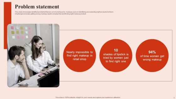 This slide showcases identified problems that are commonly faced by makeup users in identifying and selecting right products for them. Challenges includes getting wrong makeup, lipstick shades trial and finding right makeup product. Formulating a presentation can take up a lot of effort and time, so the content and message should always be the primary focus. The visuals of the PowerPoint can enhance the presenters message, so our Problem Statement Beauty Brands And Retailers Company Fund Raising Demonstration PDF was created to help save time. Instead of worrying about the design, the presenter can concentrate on the message while our designers work on creating the ideal templates for whatever situation is needed. Slidegeeks has experts for everything from amazing designs to valuable content, we have put everything into Problem Statement Beauty Brands And Retailers Company Fund Raising Demonstration PDF This slide showcases identified problems that are commonly faced by makeup users in identifying and selecting right products for them. Challenges includes getting wrong makeup, lipstick shades trial and finding right makeup product.