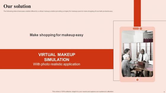 The following slide showcases solution offered by a virtual makeup solution providing company for makeup users to make shopping of cosmetic products easy. Make sure to capture your audiences attention in your business displays with our gratis customizable Our Solution Beauty Brands And Retailers Company Fund Raising Topics PDF. These are great for business strategies, office conferences, capital raising or task suggestions. If you desire to acquire more customers for your tech business and ensure they stay satisfied, create your own sales presentation with these plain slides. The following slide showcases solution offered by a virtual makeup solution providing company for makeup users to make shopping of cosmetic products easy.