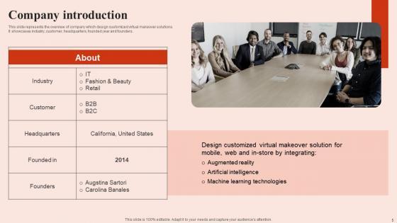 This slide represents the overview of company which design customized virtual makeover solutions. It showcases industry, customer, headquarters, founded year and founders. Slidegeeks is one of the best resources for PowerPoint templates. You can download easily and regulate Company Introduction Beauty Brands And Retailers Company Fund Raising Portrait PDF for your personal presentations from our wonderful collection. A few clicks is all it takes to discover and get the most relevant and appropriate templates. Use our Templates to add a unique zing and appeal to your presentation and meetings. All the slides are easy to edit and you can use them even for advertisement purposes. This slide represents the overview of company which design customized virtual makeover solutions. It showcases industry, customer, headquarters, founded year and founders.