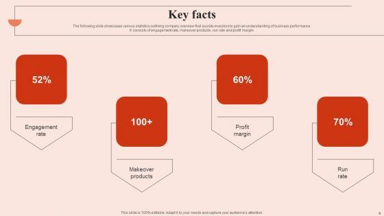 The following slide showcases various statistics outlining company overview that assists investors to gain an understanding of business performance. It consists of engagement rate, makeover products, run rate and profit margin. If your project calls for a presentation, then Slidegeeks is your go-to partner because we have professionally designed, easy-to-edit templates that are perfect for any presentation. After downloading, you can easily edit Key Facts Beauty Brands And Retailers Company Fund Raising Microsoft PDF and make the changes accordingly. You can rearrange slides or fill them with different images. Check out all the handy templates The following slide showcases various statistics outlining company overview that assists investors to gain an understanding of business performance. It consists of engagement rate, makeover products, run rate and profit margin.