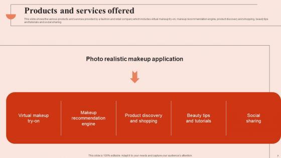 This slide shows the various products and services provided by a fashion and retail company which includes virtual makeup try-on, makeup recommendation engine, product discovery and shopping, beauty tips and tutorials and social sharing. Coming up with a presentation necessitates that the majority of the effort goes into the content and the message you intend to convey. The visuals of a PowerPoint presentation can only be effective if it supplements and supports the story that is being told. Keeping this in mind our experts created Products And Services Beauty Brands And Retailers Company Fund Raising Brochure PDF to reduce the time that goes into designing the presentation. This way, you can concentrate on the message while our designers take care of providing you with the right template for the situation. This slide shows the various products and services provided by a fashion and retail company which includes virtual makeup try-on, makeup recommendation engine, product discovery and shopping, beauty tips and tutorials and social sharing.