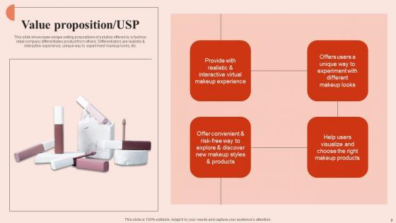 This slide showcases unique selling propositions of solution offered by a fashion retail company differentiates product from others. Differentiators are realistic and interactive experience, unique way to experiment makeup looks, etc. Explore a selection of the finest Value Proposition Usp Beauty Brands And Retailers Company Fund Raising Structure PDF here. With a plethora of professionally designed and pre-made slide templates, you can quickly and easily find the right one for your upcoming presentation. You can use our Value Proposition Usp Beauty Brands And Retailers Company Fund Raising Structure PDF to effectively convey your message to a wider audience. Slidegeeks has done a lot of research before preparing these presentation templates. The content can be personalized and the slides are highly editable. Grab templates today from Slidegeeks. This slide showcases unique selling propositions of solution offered by a fashion retail company differentiates product from others. Differentiators are realistic and interactive experience, unique way to experiment makeup looks, etc.