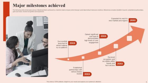 The following slide showcases various milestones that is achieved by a fashion retail company which design customized virtual makeover solutions. Milestones consists of platform launch, established partnerships, gain user base, receive recognition and expansion. If you are looking for a format to display your unique thoughts, then the professionally designed Major Milestones Beauty Brands And Retailers Company Fund Raising Themes PDF is the one for you. You can use it as a Google Slides template or a PowerPoint template. Incorporate impressive visuals, symbols, images, and other charts. Modify or reorganize the text boxes as you desire. Experiment with shade schemes and font pairings. Alter, share or cooperate with other people on your work. Download Major Milestones Beauty Brands And Retailers Company Fund Raising Themes PDF and find out how to give a successful presentation. Present a perfect display to your team and make your presentation unforgettable. The following slide showcases various milestones that is achieved by a fashion retail company which design customized virtual makeover solutions. Milestones consists of platform launch, established partnerships, gain user base, receive recognition and expansion.