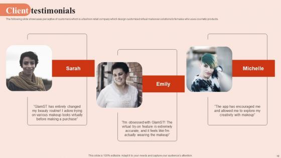 The following slide showcases perceptive of customers which is a fashion retail company which design customized virtual makeover solutions to females who uses cosmetic products. Create an editable Client Testimonials Beauty Brands And Retailers Company Fund Raising Mockup PDF that communicates your idea and engages your audience. Whether you are presenting a business or an educational presentation, pre-designed presentation templates help save time. Client Testimonials Beauty Brands And Retailers Company Fund Raising Mockup PDF is highly customizable and very easy to edit, covering many different styles from creative to business presentations. Slidegeeks has creative team members who have crafted amazing templates. So, go and get them without any delay. The following slide showcases perceptive of customers which is a fashion retail company which design customized virtual makeover solutions to females who uses cosmetic products.