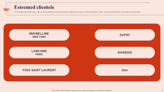 The following slide showcases current customers that uses products and services offered by company which are Maybelline, Dufry, Lancome, Shiseido, Dior, Yves Saint Laurent and Dior. Get a simple yet stunning designed Esteemed Clientele Beauty Brands And Retailers Company Fund Raising Brochure PDF. It is the best one to establish the tone in your meetings. It is an excellent way to make your presentations highly effective. So, download this PPT today from Slidegeeks and see the positive impacts. Our easy-to-edit Esteemed Clientele Beauty Brands And Retailers Company Fund Raising Brochure PDF can be your go-to option for all upcoming conferences and meetings. So, what are you waiting for Grab this template today. The following slide showcases current customers that uses products and services offered by company which are Maybelline, Dufry, Lancome, Shiseido, Dior, Yves Saint Laurent and Dior.
