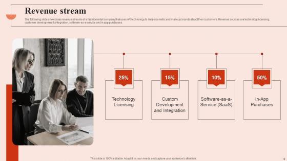 The following slide showcases revenue streams of a fashion retail company that uses AR technology to help cosmetic and makeup brands attract their customers. Revenue sources are technology licensing, customer development and integration, software-as-a-service and in app purchases. This modern and well-arranged Revenue Stream Beauty Brands And Retailers Company Fund Raising Microsoft PDF provides lots of creative possibilities. It is very simple to customize and edit with the Powerpoint Software. Just drag and drop your pictures into the shapes. All facets of this template can be edited with Powerpoint, no extra software is necessary. Add your own material, put your images in the places assigned for them, adjust the colors, and then you can show your slides to the world, with an animated slide included. The following slide showcases revenue streams of a fashion retail company that uses AR technology to help cosmetic and makeup brands attract their customers. Revenue sources are technology licensing, customer development and integration, software-as-a-service and in app purchases.