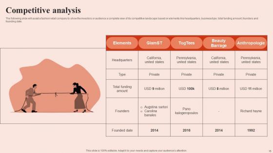 The following slide will assist a fashion retail company to show the investors or audience a complete view of its competitive landscape based on elements like headquarters, business type, total funding amount, founders and founding date. Want to ace your presentation in front of a live audience Our Competitive Analysis Beauty Brands And Retailers Company Fund Raising Graphics PDF can help you do that by engaging all the users towards you. Slidegeeks experts have put their efforts and expertise into creating these impeccable powerpoint presentations so that you can communicate your ideas clearly. Moreover, all the templates are customizable, and easy-to-edit and downloadable. Use these for both personal and commercial use. The following slide will assist a fashion retail company to show the investors or audience a complete view of its competitive landscape based on elements like headquarters, business type, total funding amount, founders and founding date.