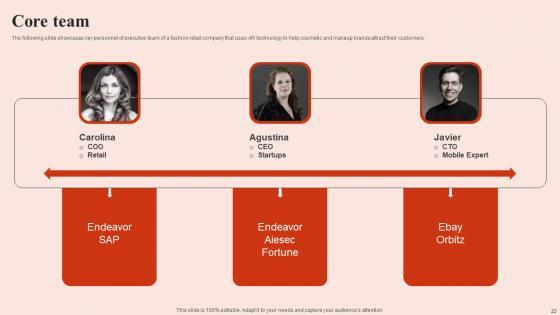 The following slide showcases key personnel of executive team of a fashion retail company that uses AR technology to help cosmetic and makeup brands attract their customers. Do you have to make sure that everyone on your team knows about any specific topic I yes, then you should give Core Team Beauty Brands And Retailers Company Fund Raising Diagrams PDF a try. Our experts have put a lot of knowledge and effort into creating this impeccable Core Team Beauty Brands And Retailers Company Fund Raising Diagrams PDF. You can use this template for your upcoming presentations, as the slides are perfect to represent even the tiniest detail. You can download these templates from the Slidegeeks website and these are easy to edit. So grab these today The following slide showcases key personnel of executive team of a fashion retail company that uses AR technology to help cosmetic and makeup brands attract their customers.
