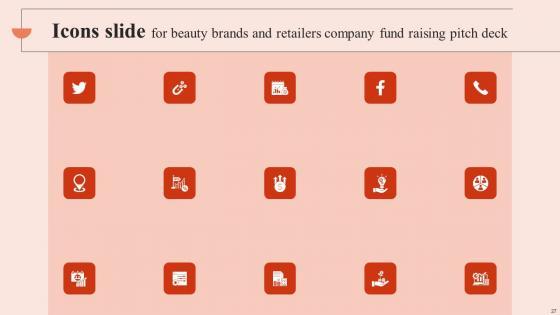 Introducing our well designed Icons Slide For Beauty Brands And Retailers Company Fund Raising Pitch Deck Mockup Pdf set of slides. The slide displays editable icons to enhance your visual presentation. The icons can be edited easily. So customize according to your business to achieve a creative edge. Download and share it with your audience. Our Icons Slide For Beauty Brands And Retailers Company Fund Raising Pitch Deck Mockup Pdf are topically designed to provide an attractive backdrop to any subject. Use them to look like a presentation pro.
