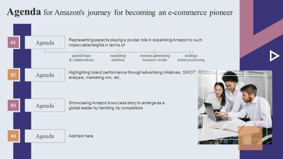 Find a pre-designed and impeccable Agenda For Amazons Journey For Becoming An E Commerce Pioneer Ideas PDF The templates can ace your presentation without additional effort. You can download these easy-to-edit presentation templates to make your presentation stand out from others. So, what are you waiting for Download the template from Slidegeeks today and give a unique touch to your presentation. Our Agenda For Amazons Journey For Becoming An E Commerce Pioneer Ideas PDF are topically designed to provide an attractive backdrop to any subject. Use them to look like a presentation pro.