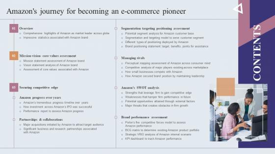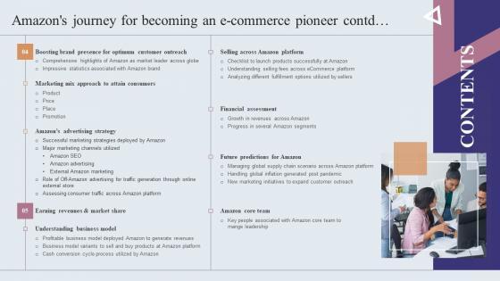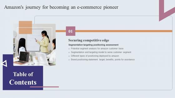 Boost your pitch with our creative Amazons Journey For Becoming An E Commerce Pioneer Table Of Contents Designs PDF Deliver an awe-inspiring pitch that will mesmerize everyone. Using these presentation templates you will surely catch everyones attention. You can browse the ppts collection on our website. We have researchers who are experts at creating the right content for the templates. So you do not have to invest time in any additional work. Just grab the template now and use them. Our Amazons Journey For Becoming An E Commerce Pioneer Table Of Contents Designs PDF are topically designed to provide an attractive backdrop to any subject. Use them to look like a presentation pro.