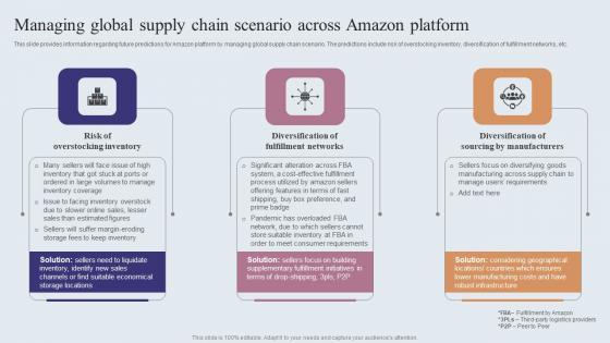This slide provides information regarding future predictions for Amazon platform by managing global supply chain scenario. The predictions include risk of overstocking inventory, diversification of fulfillment networks, etc. Here you can discover an assortment of the finest PowerPoint and Google Slides templates. With these templates, you can create presentations for a variety of purposes while simultaneously providing your audience with an eye-catching visual experience. Download Managing Global Supply Chain Scenario Across Amazons Journey For Becoming Themes PDF to deliver an impeccable presentation. These templates will make your job of preparing presentations much quicker, yet still, maintain a high level of quality. Slidegeeks has experienced researchers who prepare these templates and write high-quality content for you. Later on, you can personalize the content by editing the Managing Global Supply Chain Scenario Across Amazons Journey For Becoming Themes PDF This slide provides information regarding future predictions for Amazon platform by managing global supply chain scenario. The predictions include risk of overstocking inventory, diversification of fulfillment networks, etc.
