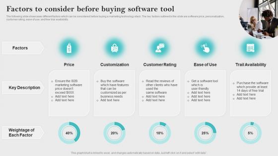The following slide showcases different factors which can be considered before buying a marketing technology stack. The key factors outlined in the slide are software price, personalization, customer rating, ease of use, and free trial availability. Coming up with a presentation necessitates that the majority of the effort goes into the content and the message you intend to convey. The visuals of a PowerPoint presentation can only be effective if it supplements and supports the story that is being told. Keeping this in mind our experts created Factors To Consider Before Innovative Business Promotion Ideas Demonstration Pdf to reduce the time that goes into designing the presentation. This way, you can concentrate on the message while our designers take care of providing you with the right template for the situation. The following slide showcases different factors which can be considered before buying a marketing technology stack. The key factors outlined in the slide are software price, personalization, customer rating, ease of use, and free trial availability.