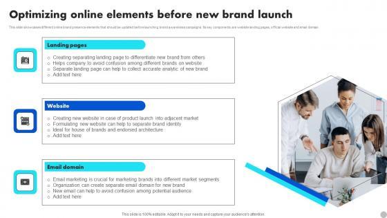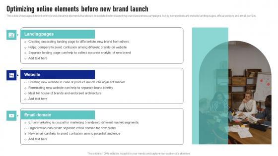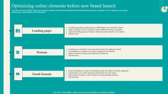 This slide showcases different online brand presence elements that should be updated before launching brand awareness campaigns. Its key components are website landing pages, official website and email domain Slidegeeks has constructed Optimizing Online Elements Before New Brand Launch Launching New Product Brand Infographics Pdf after conducting extensive research and examination. These presentation templates are constantly being generated and modified based on user preferences and critiques from editors. Here, you will find the most attractive templates for a range of purposes while taking into account ratings and remarks from users regarding the content. This is an excellent jumping-off point to explore our content and will give new users an insight into our top-notch PowerPoint Templates. This slide showcases different online brand presence elements that should be updated before launching brand awareness campaigns. Its key components are website landing pages, official website and email domain