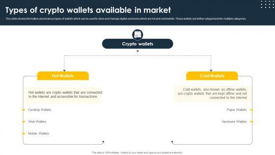 This slide shows information about various types of wallets which can be used to store and manage digital currencies which are hot and cold wallets. These wallets are further categorized into multiple categories. Whether you have daily or monthly meetings, a brilliant presentation is necessary. Complete Beginners Guide Types Of Crypto Wallets Available In Market Fin SS V can be your best option for delivering a presentation. Represent everything in detail using Complete Beginners Guide Types Of Crypto Wallets Available In Market Fin SS V and make yourself stand out in meetings. The template is versatile and follows a structure that will cater to your requirements. All the templates prepared by Slidegeeks are easy to download and edit. Our research experts have taken care of the corporate themes as well. So, give it a try and see the results. This slide shows information about various types of wallets which can be used to store and manage digital currencies which are hot and cold wallets. These wallets are further categorized into multiple categories.