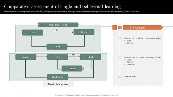 The slide showcases a comparative assessment of single loop learning and double loop learning to make adjustments to correct problem. It includes key steps like plan, check and assume. Showcasing this set of slides titled Comparative Assessment Of Single And Behavioral Learning Graphics PDF. The topics addressed in these templates are Key Highlights, Learning, Learning Includes. All the content presented in this PPT design is completely editable. Download it and make adjustments in color, background, font etc. as per your unique business setting.