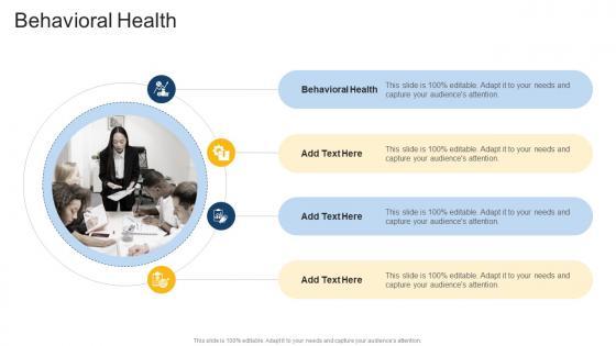 Introducing our well designed Behavioral Health In Powerpoint And Google Slides Cpb. This PowerPoint design presents information on topics like Behavioral Health. As it is predesigned it helps boost your confidence level. It also makes you a better presenter because of its high quality content and graphics. This PPT layout can be downloaded and used in different formats like PDF, PNG, and JPG. Not only this, it is available in both Standard Screen and Widescreen aspect ratios for your convenience. Therefore, click on the download button now to persuade and impress your audience. Our Behavioral Health In Powerpoint And Google Slides Cpb are topically designed to provide an attractive backdrop to any subject. Use them to look like a presentation pro.