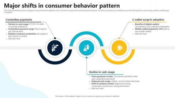 This slide presents the various changes in consumer behavior after the covid 19 in terms of payments and financial transactions. The various changes are contactless payments, the decline in cash usage, and the e-wallet surge in adoption. Create an editable Major Shifts In Consumer Behavior Pattern In Depth Guide To Digital Wallets Fin SS V that communicates your idea and engages your audience. Whether you are presenting a business or an educational presentation, pre-designed presentation templates help save time. Major Shifts In Consumer Behavior Pattern In Depth Guide To Digital Wallets Fin SS V is highly customizable and very easy to edit, covering many different styles from creative to business presentations. Slidegeeks has creative team members who have crafted amazing templates. So, go and get them without any delay. This slide presents the various changes in consumer behavior after the covid 19 in terms of payments and financial transactions. The various changes are contactless payments, the decline in cash usage, and the e-wallet surge in adoption.