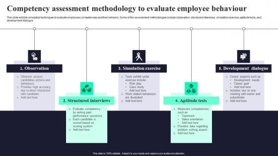 This slide exhibits simulation techniques to evaluate employees competencies and their behavior. Some of the assessment methodologies include observation, structured interviews, simulation exercise, aptitude tests, and development dialogue. Pitch your topic with ease and precision using this Competency Assessment Methodology To Evaluate Employee Behaviour Structure Pdf. This layout presents information on Observation, Structured Interviews, Aptitude Tests. It is also available for immediate download and adjustment. So, changes can be made in the color, design, graphics or any other component to create a unique layout. This slide exhibits simulation techniques to evaluate employees competencies and their behavior. Some of the assessment methodologies include observation, structured interviews, simulation exercise, aptitude tests, and development dialogue.