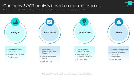 This slide showcases marketing SWOT analysis to assess brand position in market with elements such as increased competition, rise in product demand etc. Slidegeeks is here to make your presentations a breeze with Project Benchmarking Process Company Swot Analysis Based On Market Research CRP DK SS V With our easy-to-use and customizable templates, you can focus on delivering your ideas rather than worrying about formatting. With a variety of designs to choose from, you are sure to find one that suits your needs. And with animations and unique photos, illustrations, and fonts, you can make your presentation pop. So whether you are giving a sales pitch or presenting to the board, make sure to check out Slidegeeks first This slide showcases marketing SWOT analysis to assess brand position in market with elements such as increased competition, rise in product demand etc.