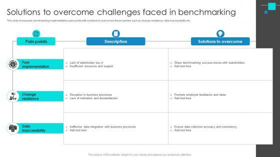This slide showcases benchmarking implementation pain points with solutions to overcomes these barriers such as change resistance, data inaccessibility etc. Do you have to make sure that everyone on your team knows about any specific topic I yes, then you should give Project Benchmarking Process Solutions To Overcome Challenges Faced In Benchmarking CRP DK SS V a try. Our experts have put a lot of knowledge and effort into creating this impeccable Project Benchmarking Process Solutions To Overcome Challenges Faced In Benchmarking CRP DK SS V. You can use this template for your upcoming presentations, as the slides are perfect to represent even the tiniest detail. You can download these templates from the Slidegeeks website and these are easy to edit. So grab these today This slide showcases benchmarking implementation pain points with solutions to overcomes these barriers such as change resistance, data inaccessibility etc.