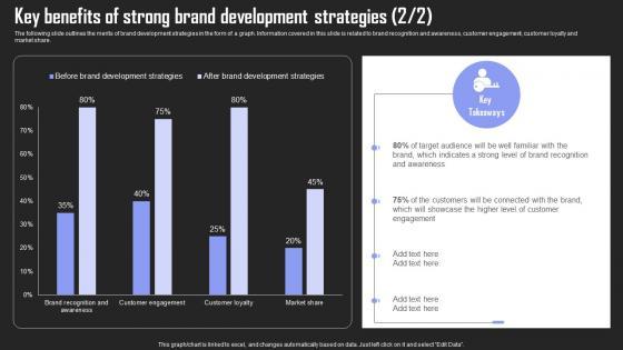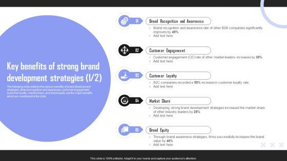 The following slide outlines the various benefits of brand development strategies. Brand recognition and awareness, customer engagement, customer loyalty, market share, and brand equity are the major benefits which are mentioned in the slide. Coming up with a presentation necessitates that the majority of the effort goes into the content and the message you intend to convey. The visuals of a PowerPoint presentation can only be effective if it supplements and supports the story that is being told. Keeping this in mind our experts created Key Benefits Of Strong Brand Building Techniques To Gain Competitive Edge Information Pdf to reduce the time that goes into designing the presentation. This way, you can concentrate on the message while our designers take care of providing you with the right template for the situation. The following slide outlines the various benefits of brand development strategies. Brand recognition and awareness, customer engagement, customer loyalty, market share, and brand equity are the major benefits which are mentioned in the slide.